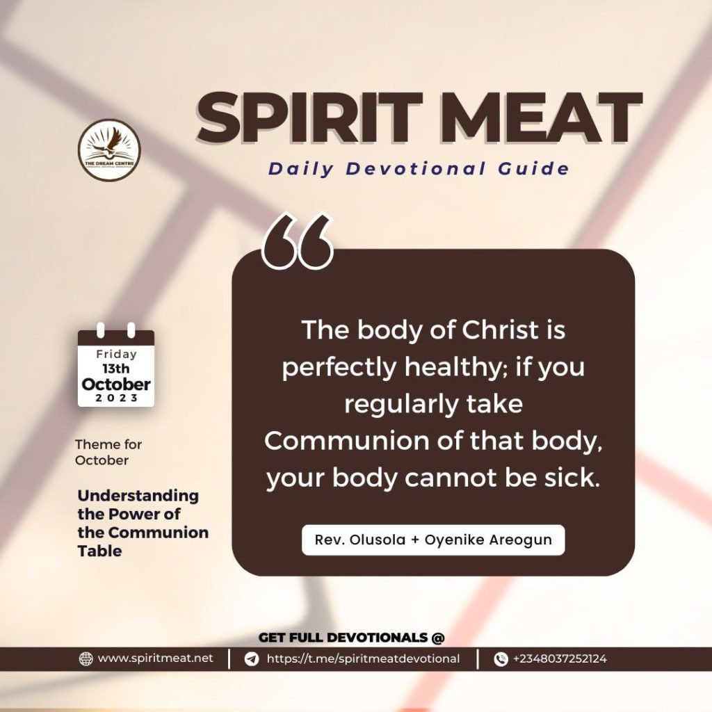 Verse 16 of 1 Corinthians 10 says, “The cup of blessing which we bless, is it not the communion of the blood of Christ? The bread which we break, is it not the communion of the body of Christ?” This is a communion of the blood of Jesus. Communion means sharing and fellowshipping. How healthy is the body of Christ? Do you agree that the body of Christ is perfectly sound and healthy and that there is no trace of sickness inside Him? If you regularly take Communion of that body, your body cannot be sick.