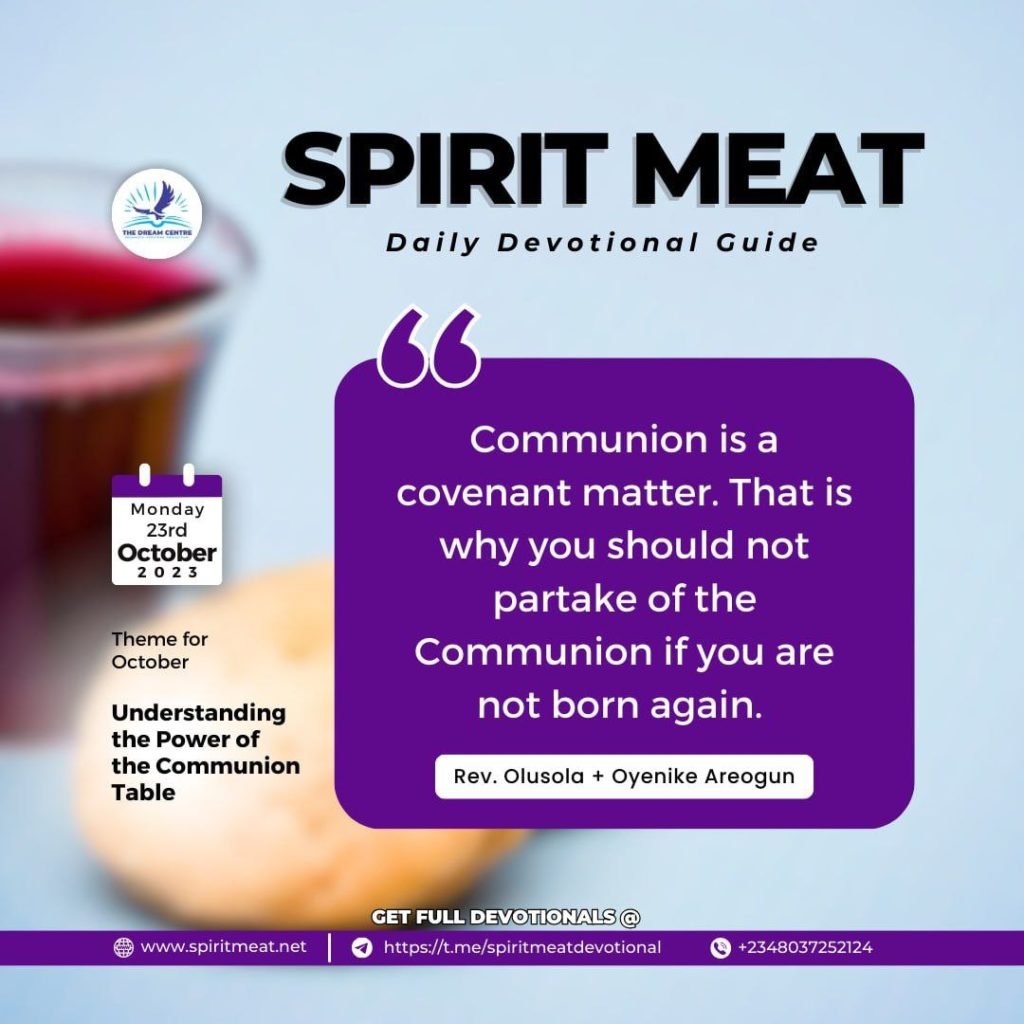 PRAYER: I appropriate the power of God into my life from today as I approach the Communion table. My matter is a matter of the covenant in Jesus’ name. Amen!
