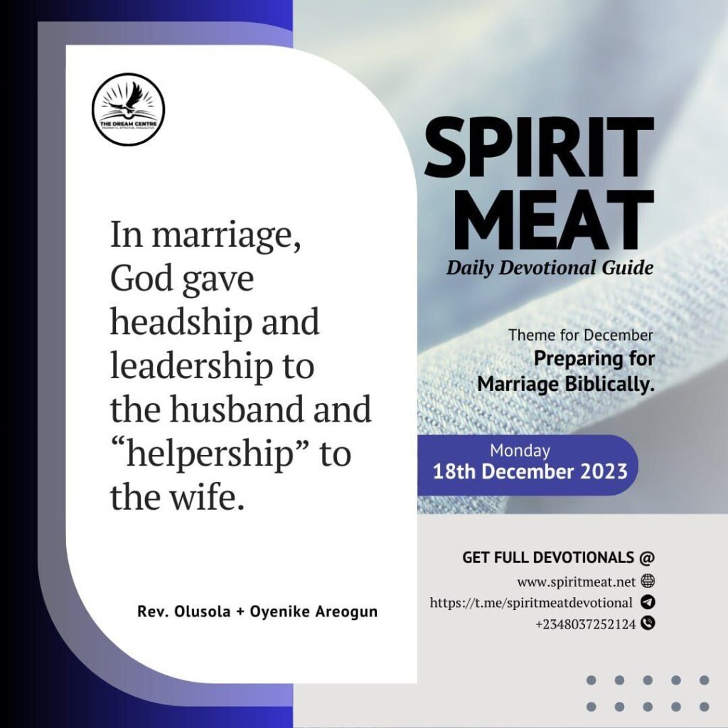 18 December 2023: THE LAW OF ROLES AND ASSIGNMENTS IN MARRIAGE (1) – Genesis 2:18; 1 Corinthians 11:8-9; Ephesians 5:22-28