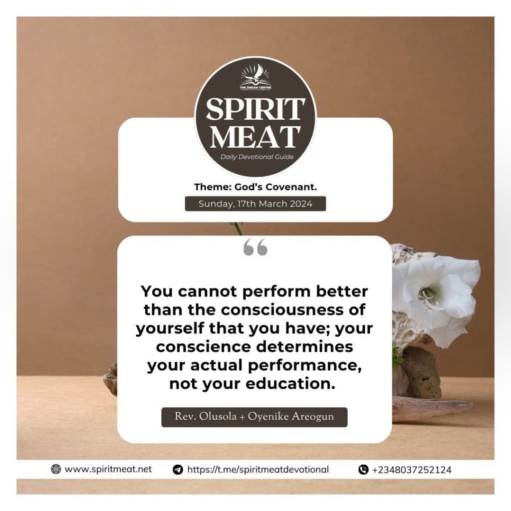 Covenant consciousness is the first thing God wants you to be baptized with if you will have a covenant compliant life. There must be a knowing and thorough conviction of God’s Covenant for you. You cannot perform better than the consciousness of yourself that you have. Your consciousness determines your actual performance, not your education. It is possible to know better than you are performing. That is why someone can be better qualified and have a lesser result than another person who is less qualified but has a greater consciousness of his ability and capacity.