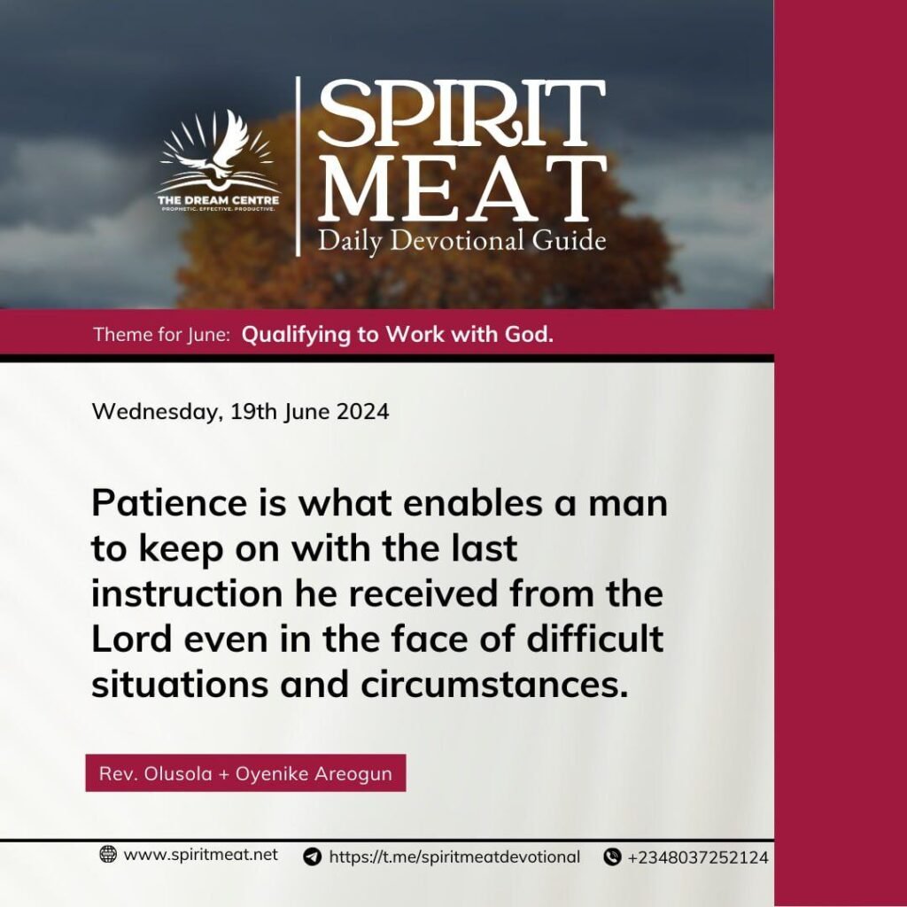 A man that God will work with must be patient with God. When a man is not patient with God, it disrupts divine activities in the life of such an individual. Patience is required to succeed in ministry and life as a whole. Patience is defined as the ability to deal with the passage of time while God is working out the details. This is where several people have a challenge in their walk with God. Patience is what enables a man to keep on with the last instruction he received from the Lord even in the face of difficult situations and circumstances.