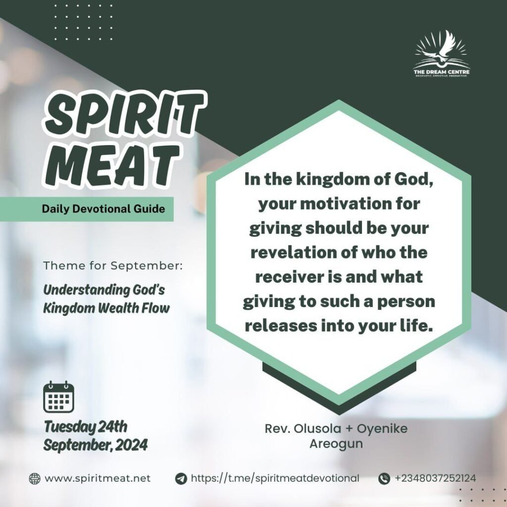 In the kingdom of God, your motivation for giving should be your revelation of who the receiver is and what giving to such a person releases into your life. If you will maintain a life of giving, there must be inflow and outflow of blessings; as the inflow of blessings comes and it causes a supernatural atmosphere upon what you are doing naturally, it brings the extra factor of grace on your natural abilities.