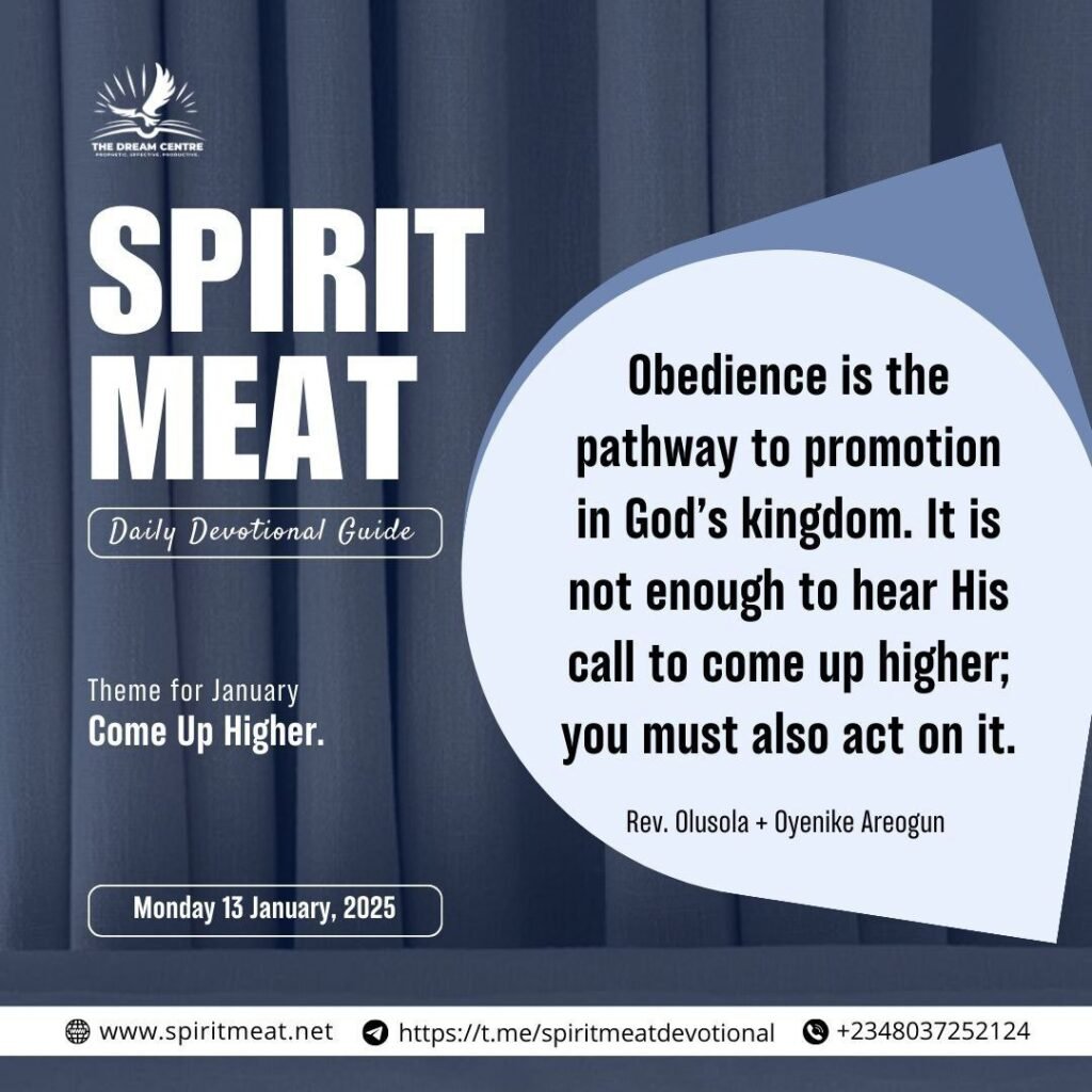 Obedience is the pathway to promotion in God’s kingdom. It is not enough to hear His call to come up higher; you must also act on it. Saul’s failure to obey God’s instruction cost him the kingdom (1 Samuel 15:22-23), while Jesus, through perfect obedience, fulfilled His divine mission.