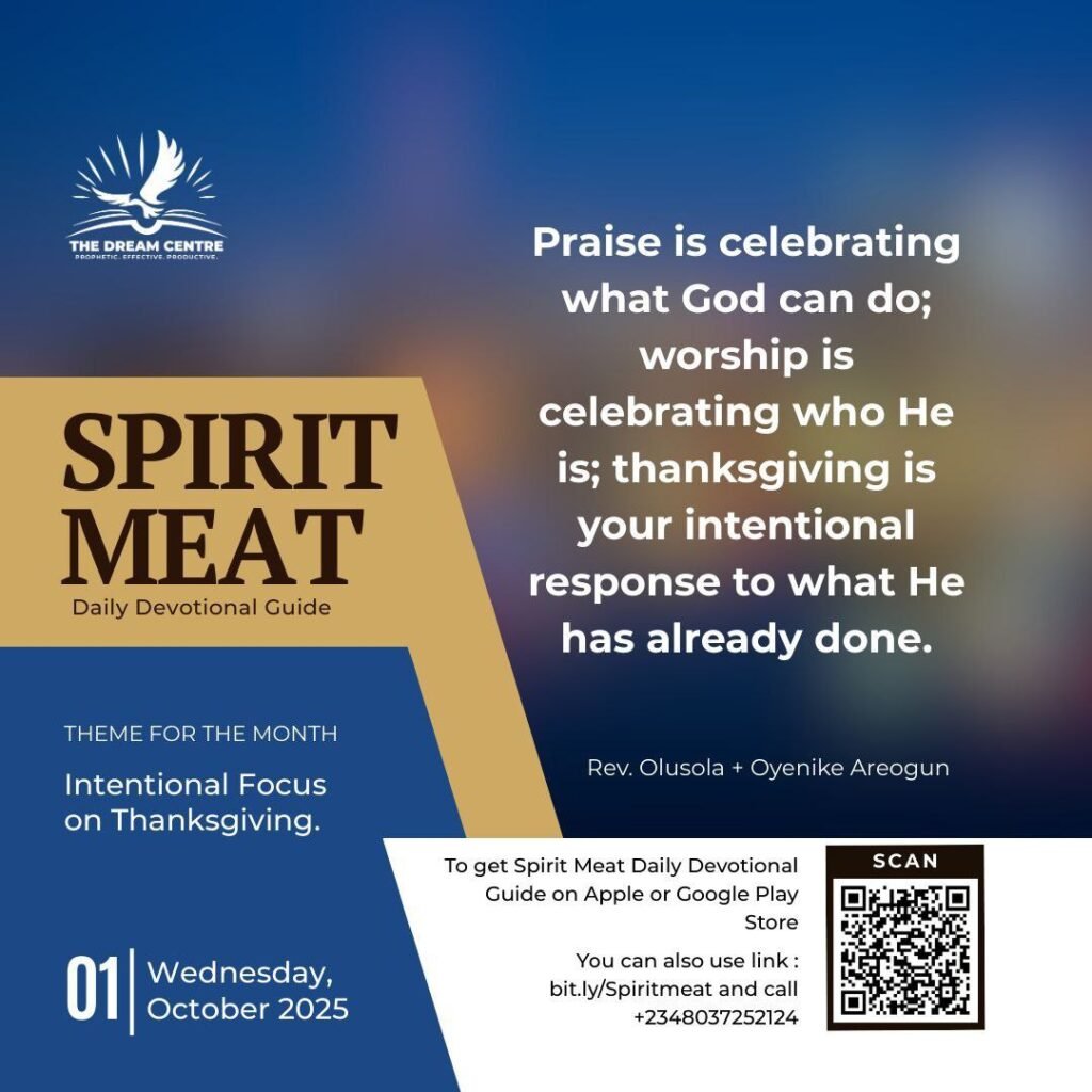 This month, I encourage you to take intentional focus on thanksgiving. Praise is celebrating what God can do; worship is celebrating who He is; thanksgiving is your intentional response to what He has already done. It is the attitude of a heart that acknowledges mercy received, aid given, and danger escaped. In Luke 17, there were ten cured men but one who came back to thank — and he was healed. God wants you to “return.” Do not take things for granted. Thank Him for what He has done, what He is not giving you, and what He is not giving you from.