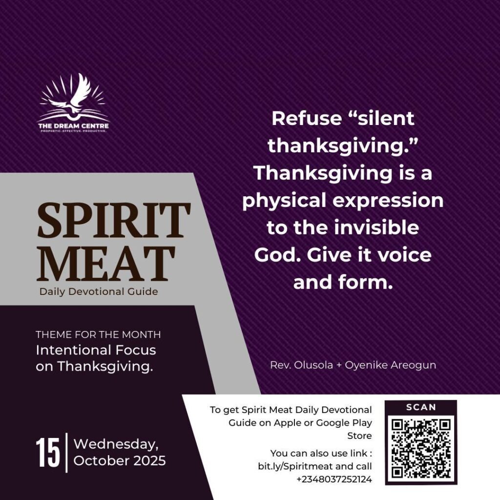 Also, refuse “silent thanksgiving.” Thanksgiving is a physical expression to the invisible God. Give it voice and form. The woman with the alabaster box broke her perfume openly, and the Lord established her act as a perpetual memorial (Matt. 26:13). Let your gratitude intimidate the devil and encourage the saints. Speak it in prayer, sing it in worship, testify in church, write it in a note, show up in person, or give a memorial seed — do not hide the faithfulness of God behind private feelings.