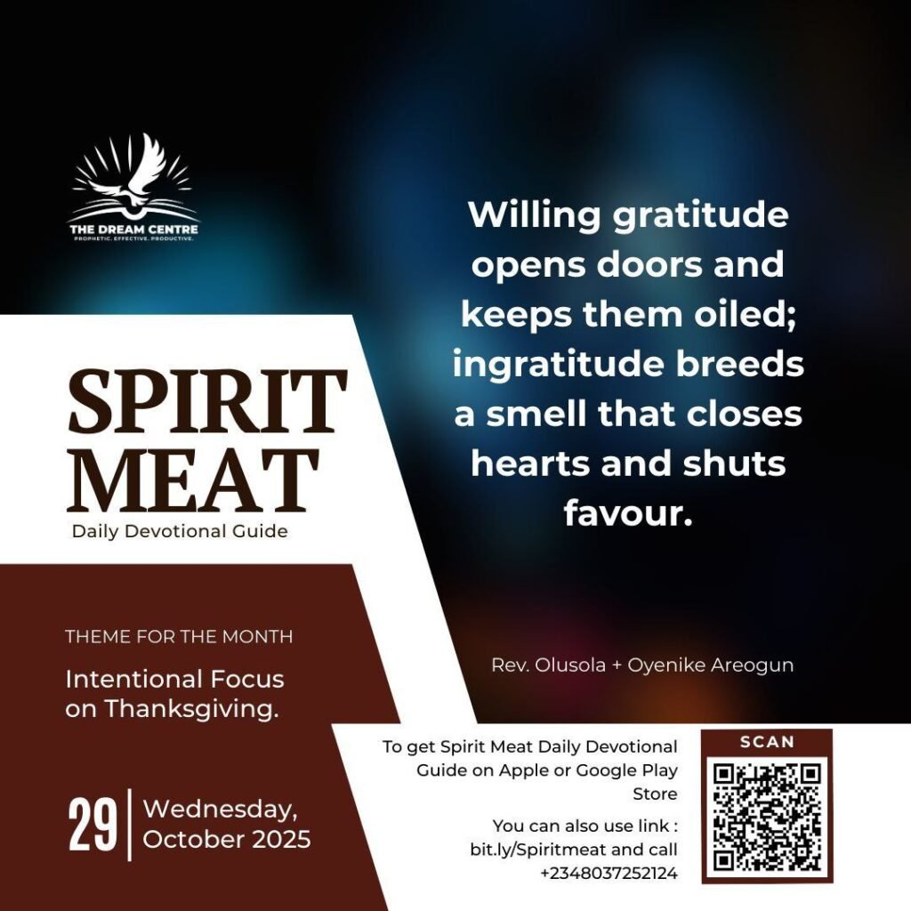 Your thanksgiving must also be willing. In David’s day, “the people rejoiced, for that they offered willingly” (1 Chr. 29:9, KJV). Forced thanks is hollow; reluctant honour carries no weight before Heaven. Let willingness rise from revelation: If the Lord had not been there, the enemy needed only moments to finish the job. The breath in your nostrils, the doors that opened, the traps you did not see — all point to a present Help. Willing gratitude opens doors and keeps them oiled; ingratitude breeds a smell that closes hearts and shuts favour.
