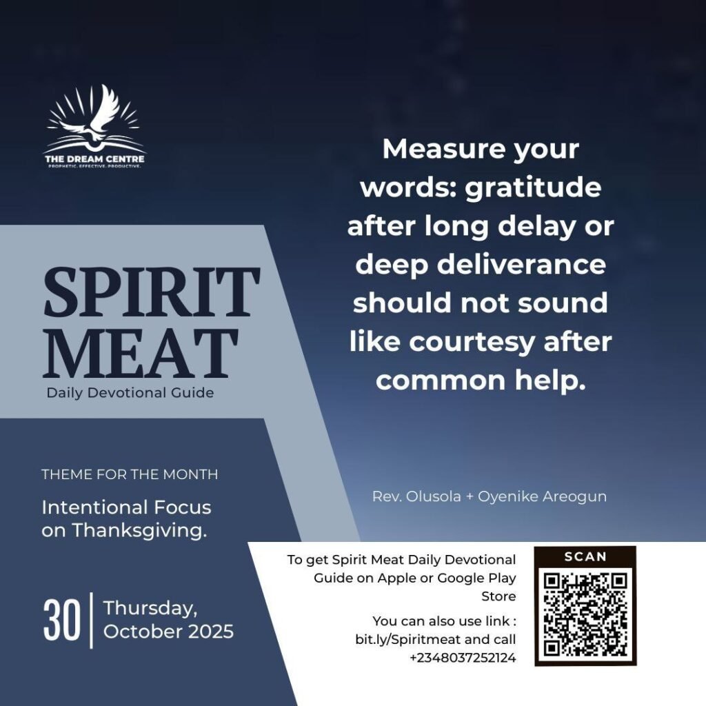 Thanksgiving must also be measured. Weigh three things as you return to God. First, measure your attitude: let it fit the occasion and the magnitude of the mercy. An entitled heart shrinks honour; a humbled heart enlarges it. Second, measure your words: gratitude after long delay or deep deliverance should not sound like courtesy after common help. Hannah’s language was different from Peninnah’s because her path was different; let your vocabulary match your visitation. Third, measure your act: bring a response that tells the truth about the weight of grace — your posture, your offering, your testimony, your visit to honour a channel. Heaven reads proportion.