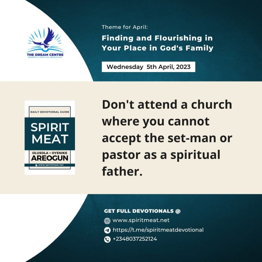 God operates with families and generations in mind. The Church is a spiritual family where the mandate and Kingdom flows are perpetuated down the generations in increasing measure. The Kingdom of God is a father-and-son-unlimited relationship. God told me to tell His people that no one should attend a church where he or she cannot accept the set-man/pastor as a spiritual father because the things of God are inherited and not earned.