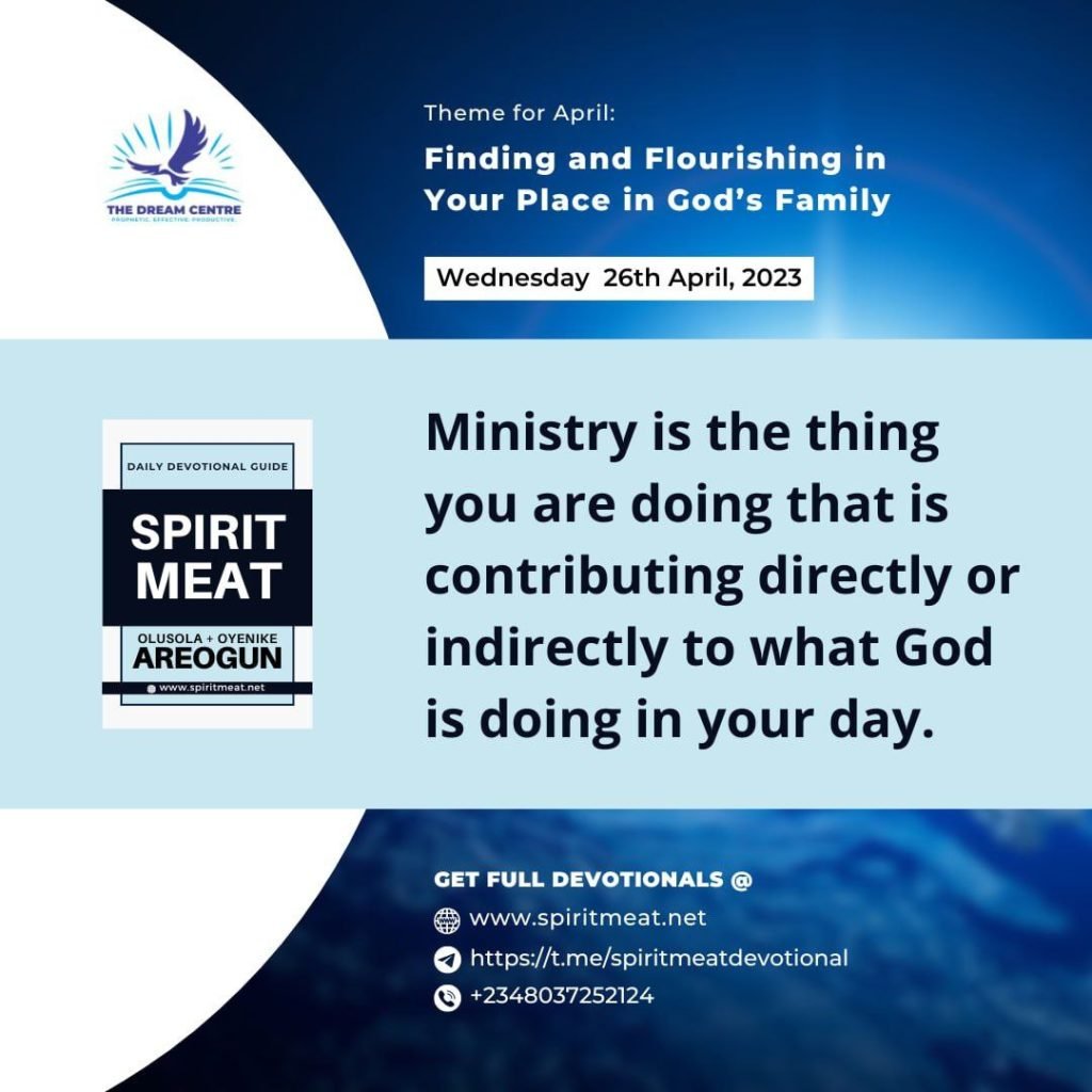 Ministry is the thing you are doing that is contributing directly or indirectly to what God is doing in your day. You get involved in the Church in either of two ways: directly as a local church member or indirectly as an officer (like apostles, prophets, evangelists, pastors, and teachers) in the global church.