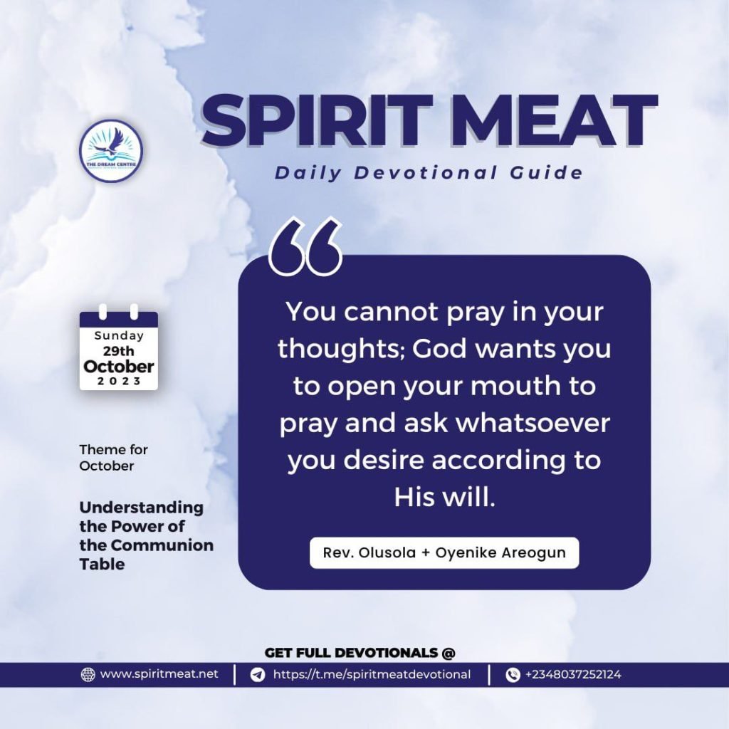 Prayer time is a time for you to open your mouth. You cannot pray in your thoughts. God wants you to open your mouth to pray and ask whatsoever you desire according to His will, and you will see the power and possibility available to you in prayer (1 Joh. 5:14).