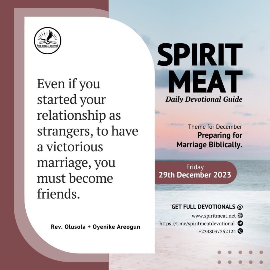 Most Christians start their relationships as strangers. Unbelievers, however, have better marriages than Christians at times because they usually start as friends. Even if you started your relationship as strangers, to have a victorious marriage, you must become friends. I pray that every married couple reading this will convert to friends if you are not. Friends always enjoy each other. As Christians, you have the foundation (that is, God led you to each other), but you must become friends so you can sit down, talk, and enjoy life together.