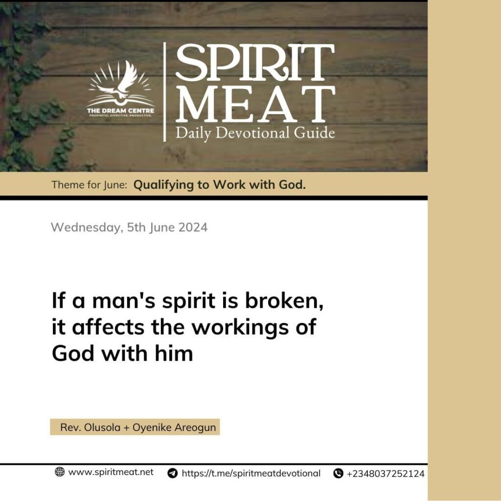 Prov. 18:14 says, ”a broken spirit who can bear?”. If a man’s spirit is broken, it affects the working of God with that man and that is one thing that the devil does to the ministers of the gospel; he wants to get you into a place that you’re wounded inside.