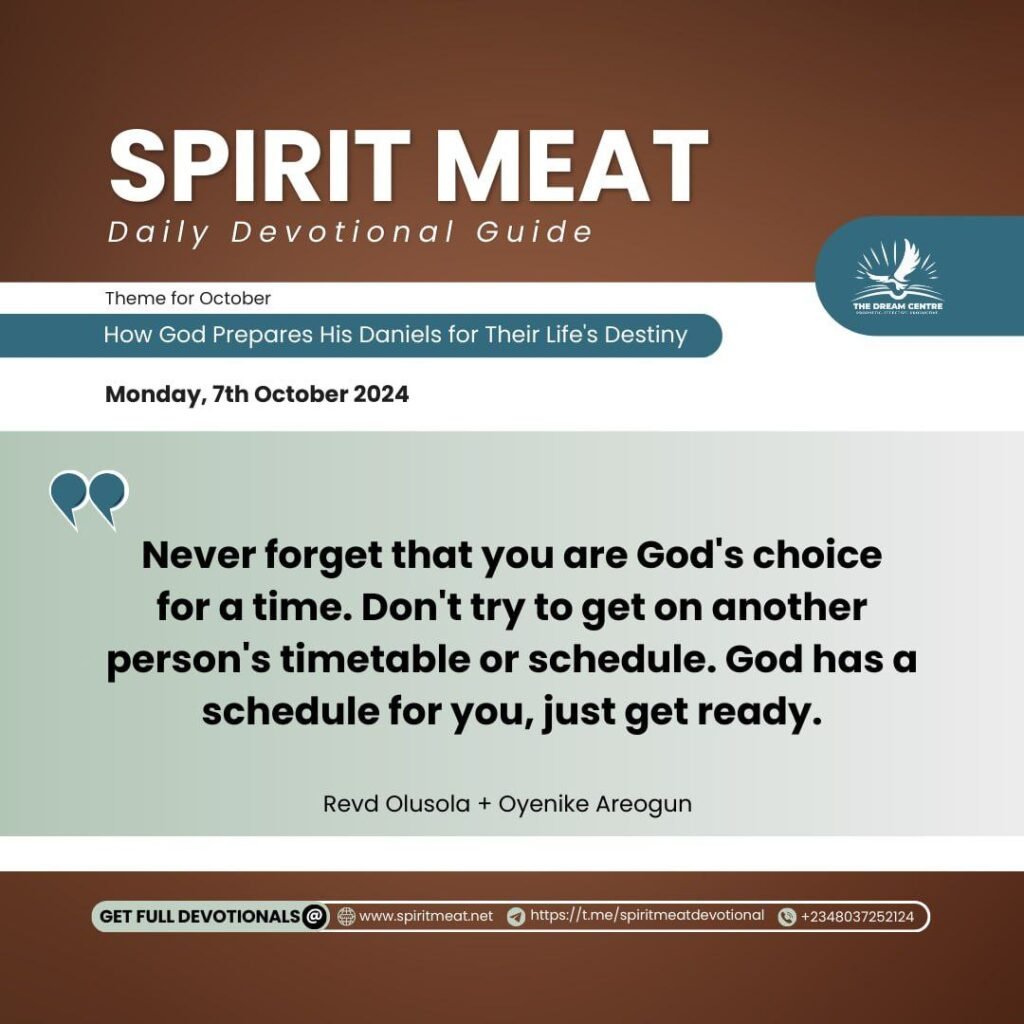 Don’t try to get on another person’s timetable or schedule. God has a schedule for you, just get ready. Get all the preparations and all the arrangements. Maybe the problem you have is not that the devil was that powerful but that you moved before your time. If God has chosen you to be part of the Daniel’s company, ensure you read His timetable properly.