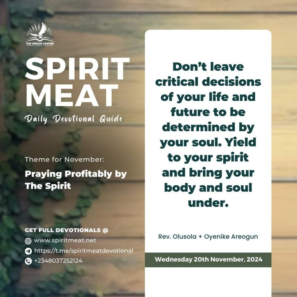 Don’t leave critical decisions of your life and future to be determined by your soul. Making soulish decisions can make you lesser than what God has ordained for you. Yield to your spirit and bring your body and soul under.