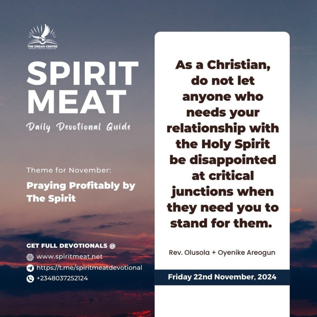 As a Christian, do not let anyone who needs your relationship with the Holy Spirit be disappointed at critical junctions when they need you to stand for them. There are items of information flowing in that river of the Spirit. There might be people who are close to you that the enemy wants to entrap, and you are the only one who can pick it such information in the spirit.