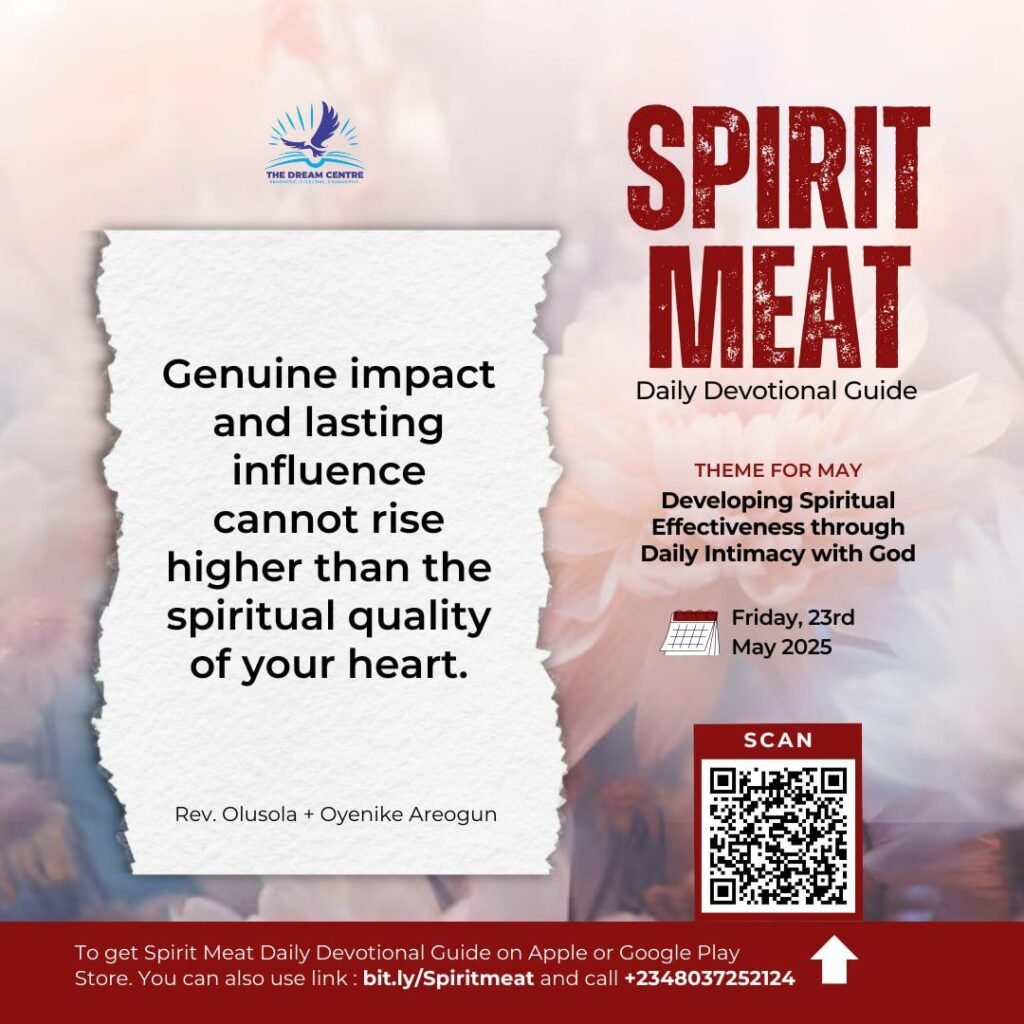 Reflect on your inner spiritual life today. Is your heart healthy enough to sustain the calling God placed upon you? Prioritise your inner spiritual growth, and you will naturally experience increased outward effectiveness and impact.